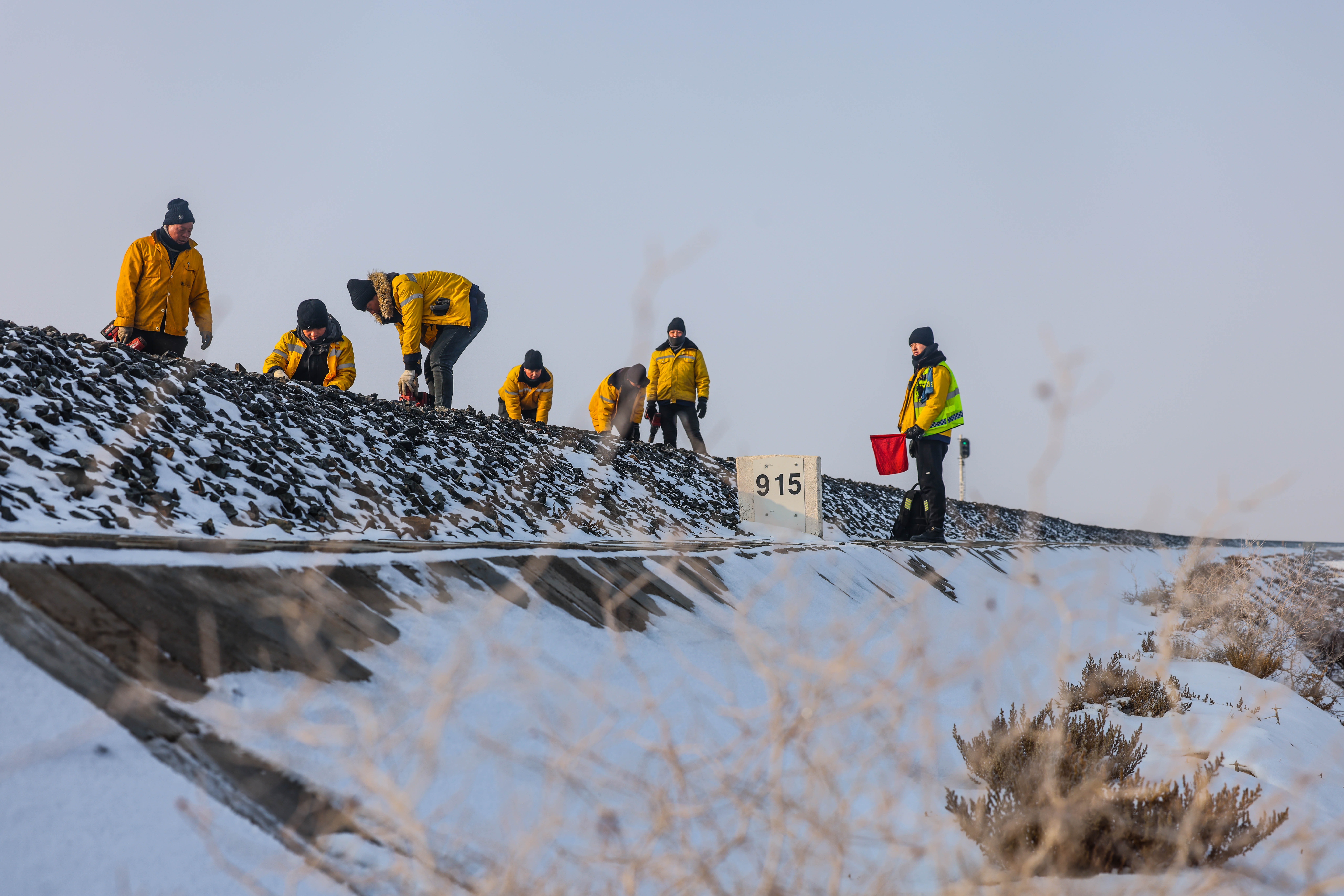 巡检时,他们手中紧握检查锤、扭力扳手等工具,顶着刺骨寒风逐个检查着钢轨上的每一个零件。时常早出晚归,户外作业长达10小时,一天下来,往往腰酸背痛。由于时间紧任务重,中午无法返回小站,常常携带便餐在户外席地而坐,有时是司机送来的盒饭,碰到起风时,大家只能拌沙下咽。