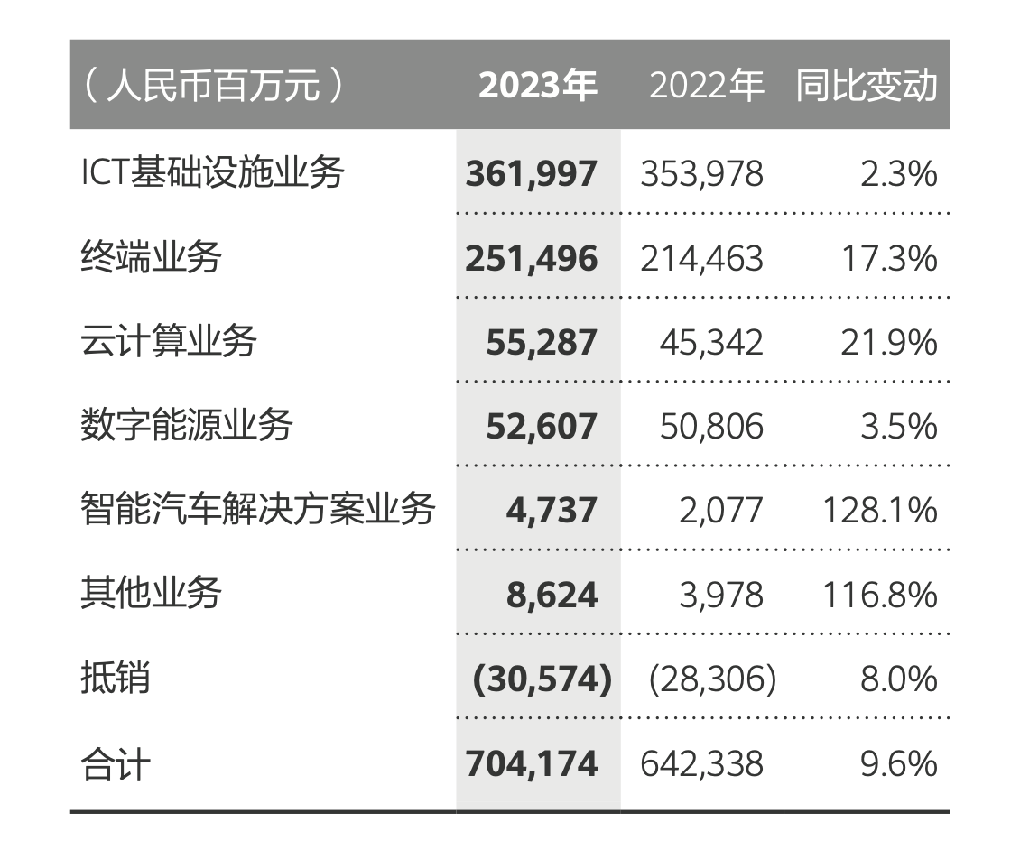 2023年,华为ICT基础设施业务实现销售收入3620亿元人民币,同比增长2.3%;云计算业务实现销售收入553亿元人民币,同比增长21.9%;数字能源业务实现销售收入526亿元人民币,同比增长3.5%。