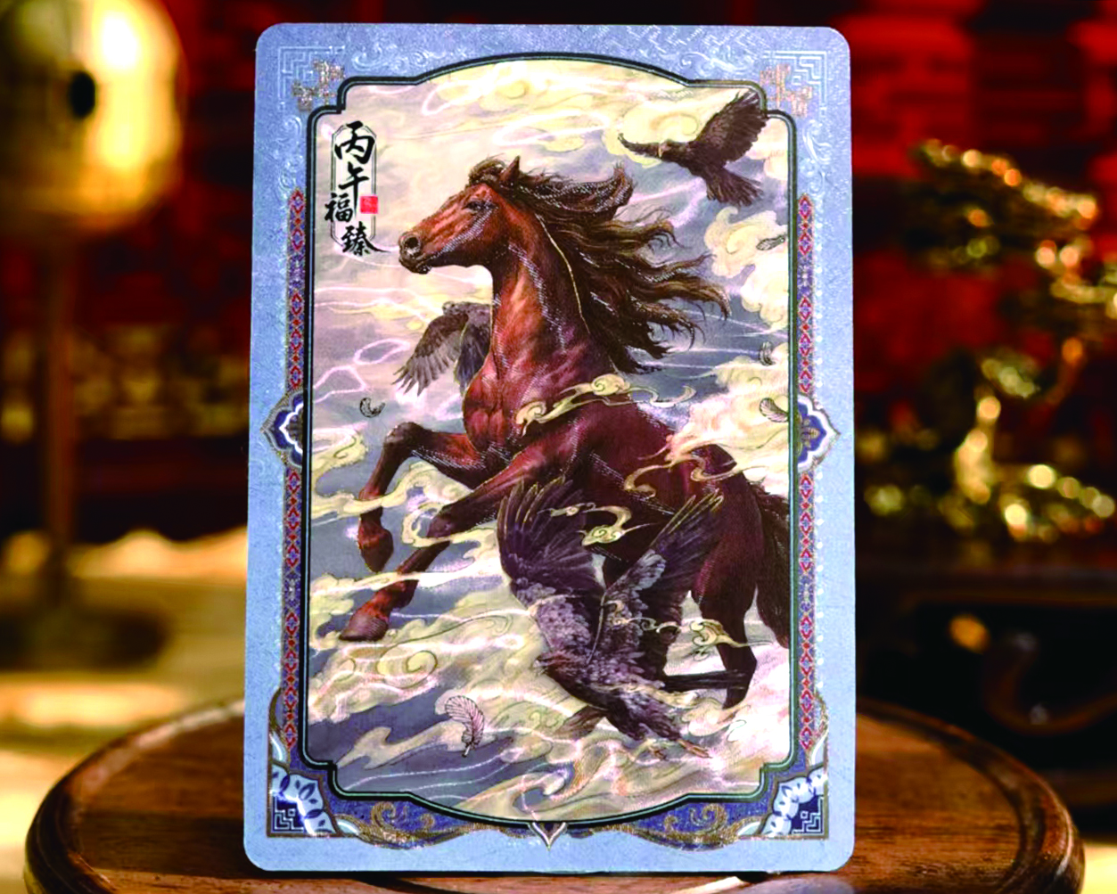 工业制造的硬核支撑,让文化创意得以落地。此次春晚卡牌采用的定制折光、防伪油墨变色、光刻浮雕等技术,正是这种能力的集中体现。用指尖触摸卡牌上的马身,能触到绸缎般的纹理,“丙午福臻”四个字在紫光灯下产生变色效果,边框的光刻浮雕让纹样线条立体起来。